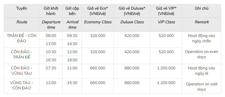Côn Đảo Express 36 được đưa vào hoạt động trong Quý I năm 2019 (chính thức là ngày 14/2/2019 sẽ khai trương tuyến Vũng Tàu - Côn Đảo) với lịch trình và giá vé dự kiến như sau: Con Dao Express 36 is planted to operate in the first quarter of 2019 with the tentative itinerary and service fare as below table: Lưu ý: Miễn vé áp dụng cho trẻ em dưới 06 tuổi, phải có chiều cao dưới 1m20 và đi cùng người lớn. Trẻ em được miễn vé phải sử dụng chung chỗ của người lớn đi cùng. Mỗi người lớn được kèm không quá 01 (một) trẻ em miễn vé đi cùng. LỊCH CHẠY TÀU THÁNG 2/2019 LỊCH CHẠY TÀU THÁNG 3/2019 CÁC ĐẠI LÝ VÉ TÀU CAO TỐC CÔN ĐẢO - VŨNG TÀU 1. Liên hệ mua và giao vé tại Côn Đảo: 0987 556 294 Địa chỉ: Số 25 đường Võ Thị Sáu, huyện Côn Đảo, tỉnh Bà Rịa - Vũng Tàu 2. Liên hệ mua và giao vé tại TP Bà Rịa: 0389546426 Địa chỉ: Số 100 Phạm Văn Đồng, Phước Trung, TP Bà Rịa, tỉnh Bà Rịa - Vũng Tàu 3. Liên hệ mua và giao vé tại TP Vũng Tàu: 088 937 1234 Địa chỉ: Số 30 Nguyễn Du, Phường 1, TP Vũng Tàu, tỉnh Bà Rịa - Vũng Tàu Chúng tôi nhận giao vé qua ZALO, EMAIL, FACEBOOK....đối với các khách hàng trên khắp cả nước. Để đặt vé cho các đoàn từ 10 người trở lên, quý khách vui lòng liên hệ HOTLINE: 088 937 1234 - 0938 948 549 Hướng dẫn đặt vé tàu cao tốc Côn Đảo Express tuyến Vũng Tàu - Côn Đảo Đặt vé đảm bảo (Chuyển khoản, nhận ngay vé điện tử) Bước 1: Gọi điện thoại đặt chỗ một trong những số điện thoại được nêu trên, cung cấp thông tin cá nhân (Họ và tên / Số chứng minh nhân dân / Năm sinh) và phương thức nhận vé. Bước 2: Nhận tin nhắn xác nhận & thanh toán. Bước 3: Nhận vé điện tử bằng định dạng file .pdf qua e-mail hoặc ứng dụng Zalo. Quý khách có thể in ra giấy A4 hoặc lưu vào điện thoại là có thể sử dụng để lên tàu. Đặt vé không đảm bảo (Hẹn giờ nhận vé, trả tiền mặt) Quý khách sẽ được yêu cầu lấy vé trước một khoảng thời gian nhất định so với thời điểm tàu chạy. Nếu quý khách nhận vé và thanh toán đúng hẹn, vé sẽ bị hủy và có thể sẽ không được thông báo. Liên hệ đặt vé tàu cao tốc Côn Đảo Express chạy tuyến Vũng Tàu - Côn Đảo và Côn Đảo - Vũng Tàu, quý khách vui lòng gọi đến số HOTLINE: 088 937 1234 Website: https://www.vetaucondao.vn Email: taucaotoccondao@gmail.com Fanpage: https://www.facebook.com/taucaotoccondaovungtau Lịch chạy tàu Vũng Tàu - Côn Đảo - Trần Đề chi tiết từng ngày, tháng trong năm 2019